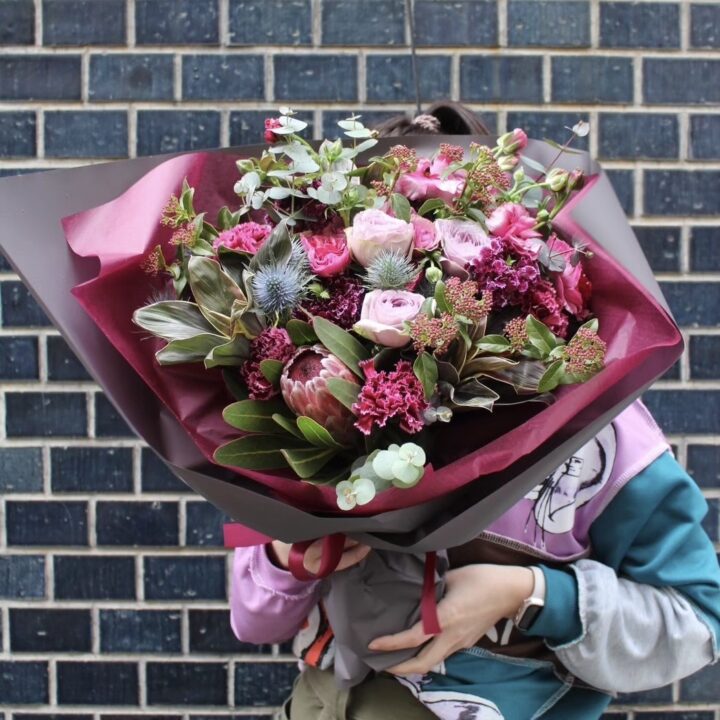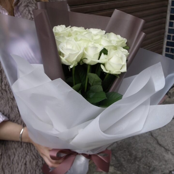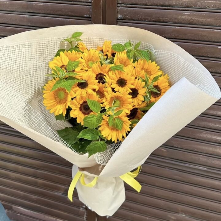 お届けするバラは全て水あげ(水分を充分吸い上げさせ花持ちをよくする方法)とトゲも処理しているのでお渡しする方への配慮もしっかりされた花束です。